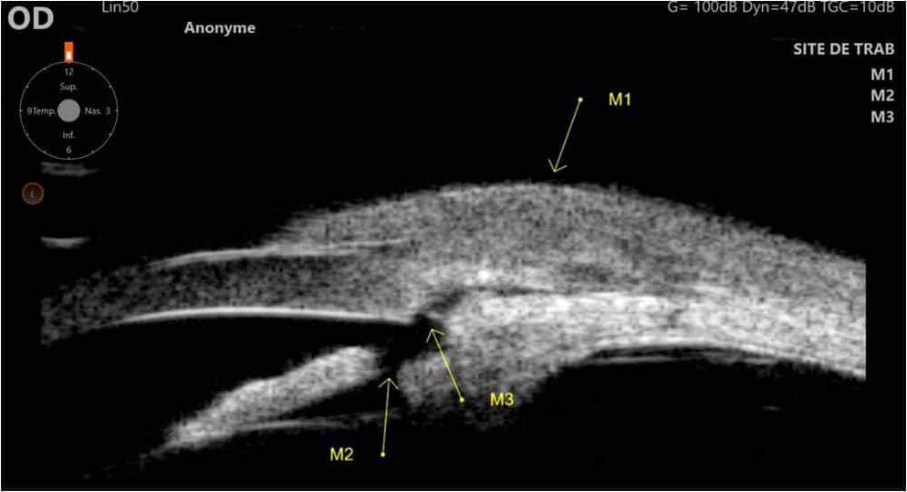 (M1) Bulle de filtration (M2) site de trabéculectomie proprement dit (M3) iridectomie périphérique chirurgicale.