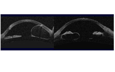 Volumineux kyste iriens, à la fois développés aux dépends du stroma irien (cliché de gauche) et de l’épithélium pigmenté irien (cliché de droite), et entrainant une fermeture localisée de l’angle irido-cornéen avec apposition de l’iris contre la trabéculum et...