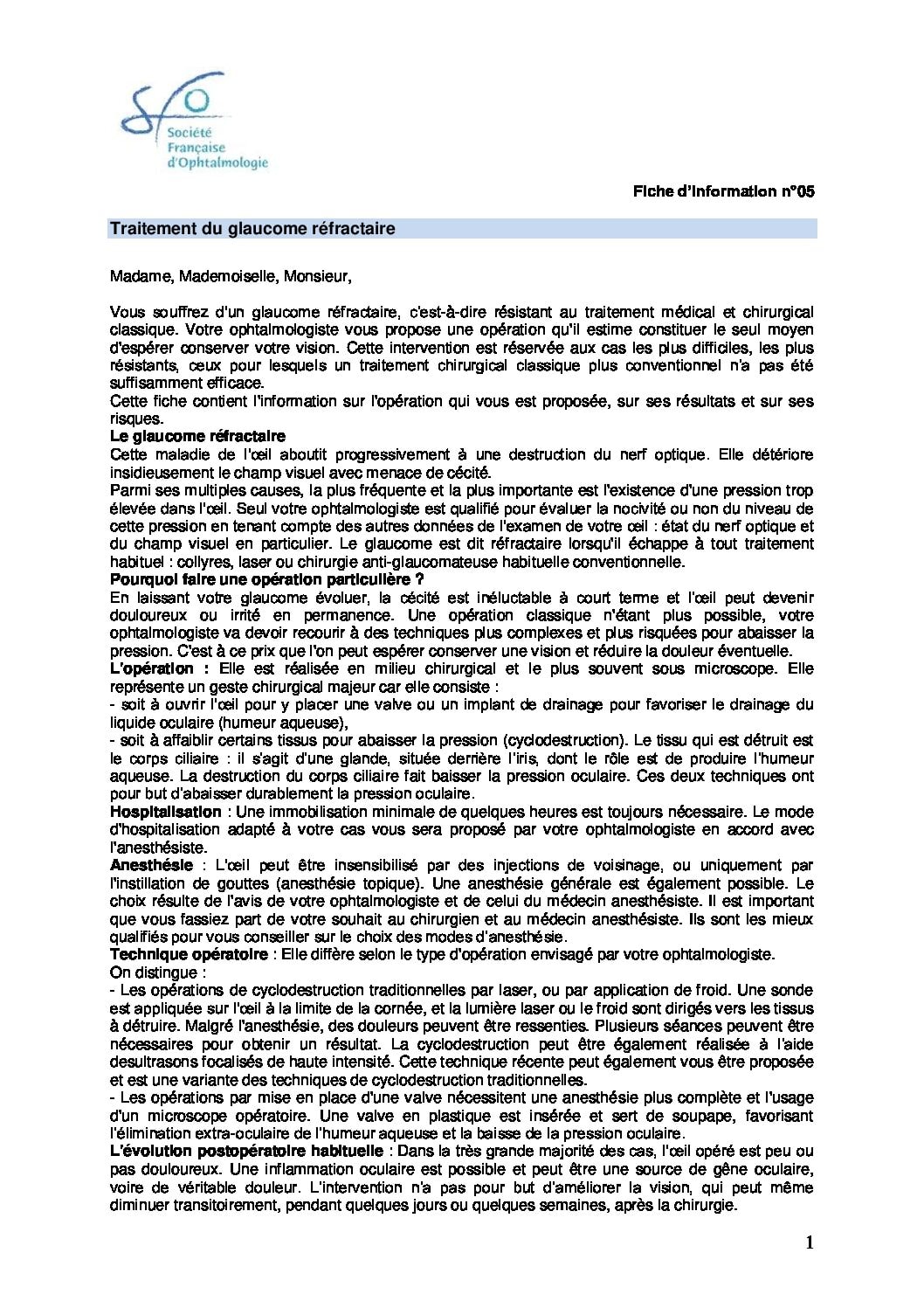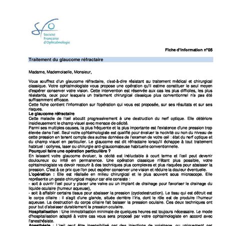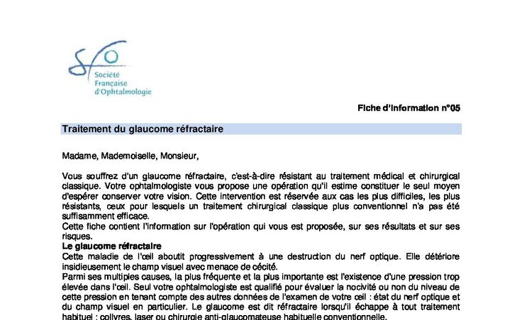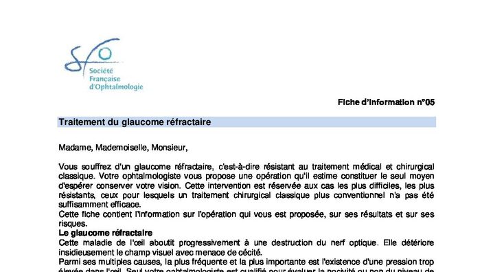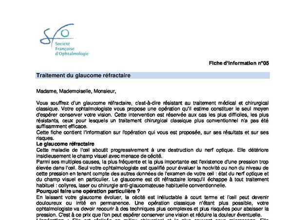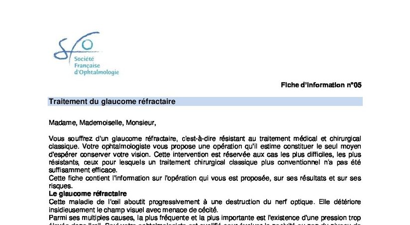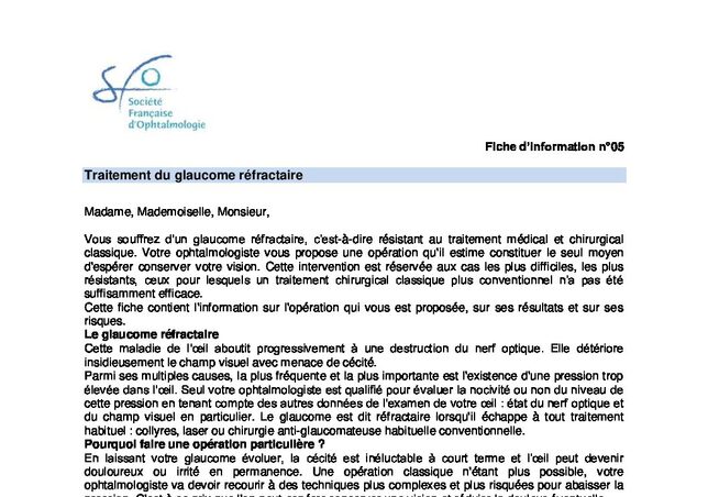 Vous souffrez d’un glaucome réfractaire, c’est-à-dire résistant au traitement médical et chirurgical classique. Votre ophtalmologiste vous propose une opération qu’il estime constituer le seul moyen d’espérer conserver votre vision. Cette intervention est réservée aux cas les plus difficiles, les plus résistants, ceux pour lesquels un traitement chirurgical classique plus conventionnel n’a pas été suffisamment efficace.