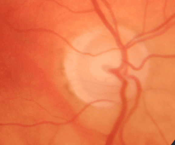 Au fond d’œil (photos post opératoires précoces fig 1 )les papilles sont colorées, il existe une atrophie péripapillaire en particulier à droite et une excavation chiffrée à 0.3 sans encoche, à gauche l’excavation est plus marquée (0.4) mais régulière, l’anneau neurorétinien est bien coloré, aucune hémorragie satellite n’est notée.